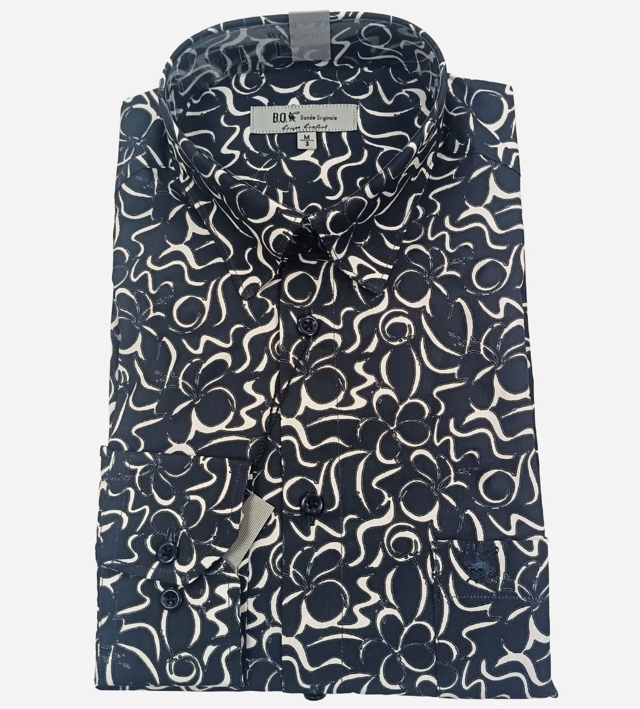 Chemise manches longues bleu Navy imprimé fleurs graphiques blanches